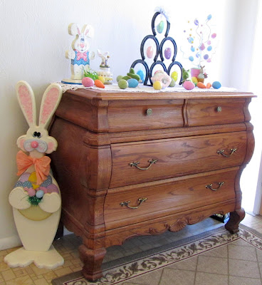 The tall bunny that stands in the corner by the desk is a looong ago, garage sale purchase. It was pretty shabby so when I got it home, I gave it a good cleaning and a lot of paint touch ups. I also added the orange bow around his neck and greenery and eggs to the basket he is holding in his arms.